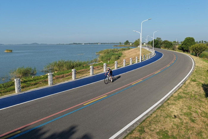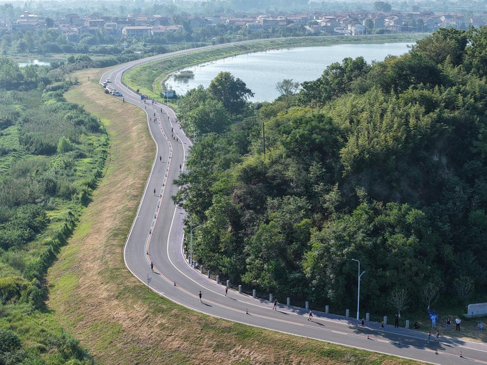 赛事场地依托梁子湖优越的自然生态条件,精心打造“水、陆、骑”三位一体的生态赛道:游泳赛段位于水质达Ⅲ类以上的梁子湖公开水域,骑行赛道穿行于入选2024“中国骑行地图”的107公里环湖绿道,跑步赛道则融合湖光山色,让选手在自然美景中完成冲刺。