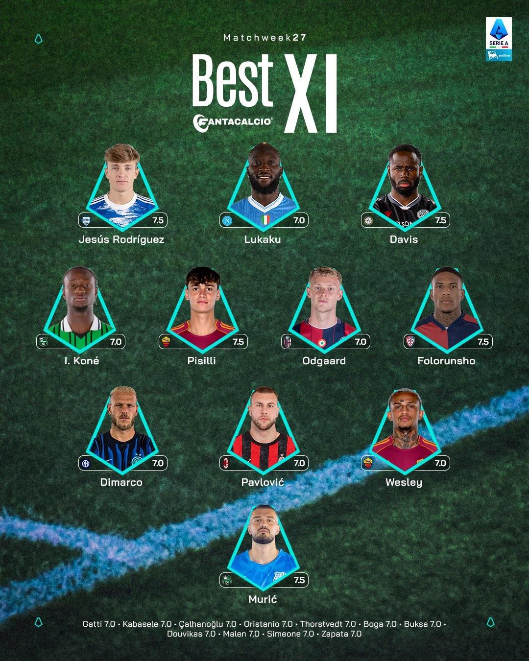 中场:伊斯梅尔-科内(萨索洛)、皮西利(罗马)、延斯-厄德高(博洛尼亚)、弗洛伦肖(卡利亚里)
